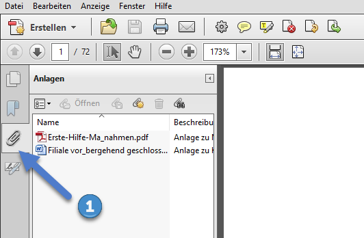 Abbildung: Anhänge im Adobe Reader unter dem Büroklammersymbol aufrufen