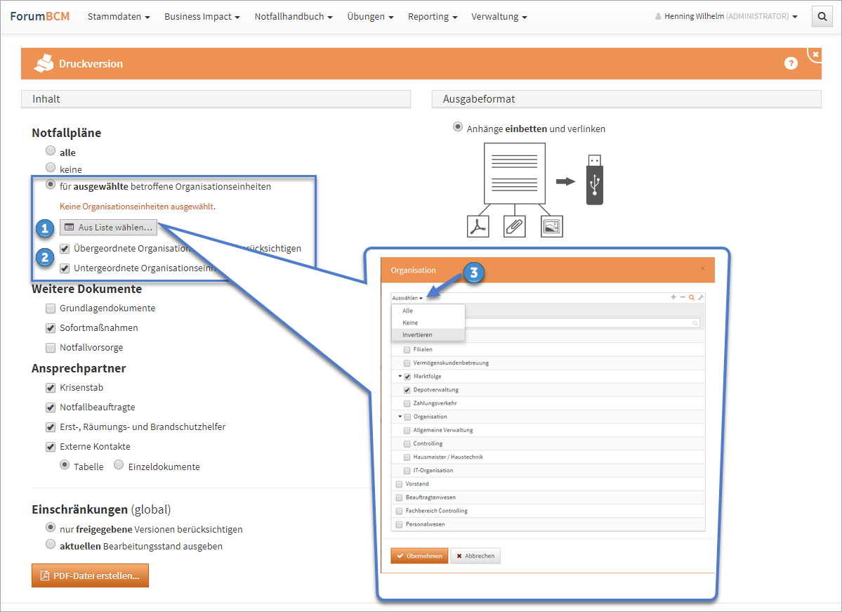 Mit dieser Variante können Sie ein Notfallhandbuch erzeugen, welches eine Teilmenge des unternehmensweiten Handbuchs enthält. Es werden alle relevanten Notfallinformationen, die sich auf die gewähltenn Organisationseinheiten (1) beziehen, ausgegeben. Die über- und untergeordneten Organisationseinheiten werden standardmäßig zusätzlich berücksichtigt (2). Im Beispiel sind zwei Organisationseinheiten gewählt, über die Funktion "Auswahl invertieren" kann die Auswahl umgekehrt werden.